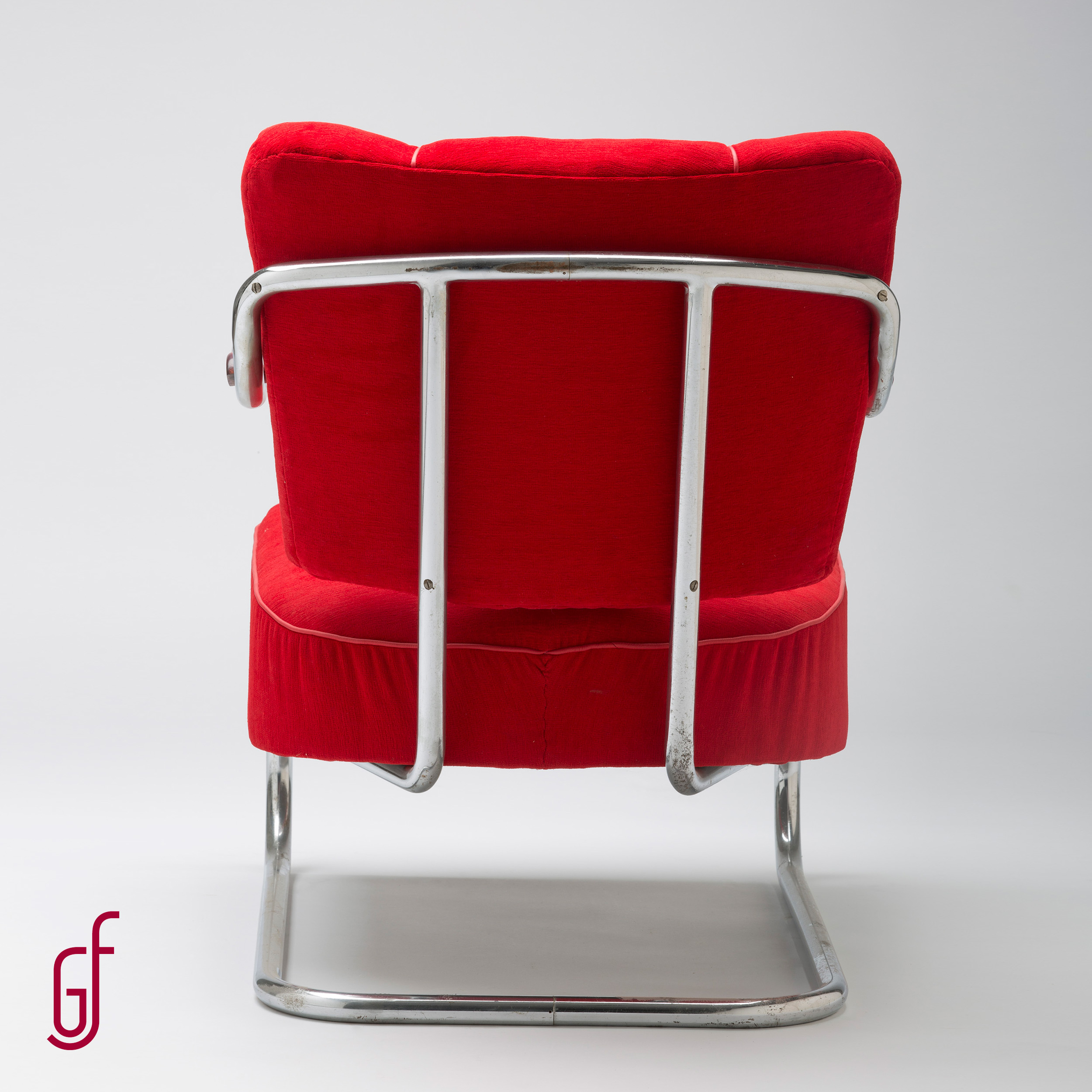 dborně restaurovaný originál, nová výplň a čalounění s kontrastní koženou paspulí, původní dřevo vyspraveno a lakováno v matném laku, původní chrom odborně vyleštěn