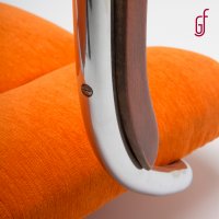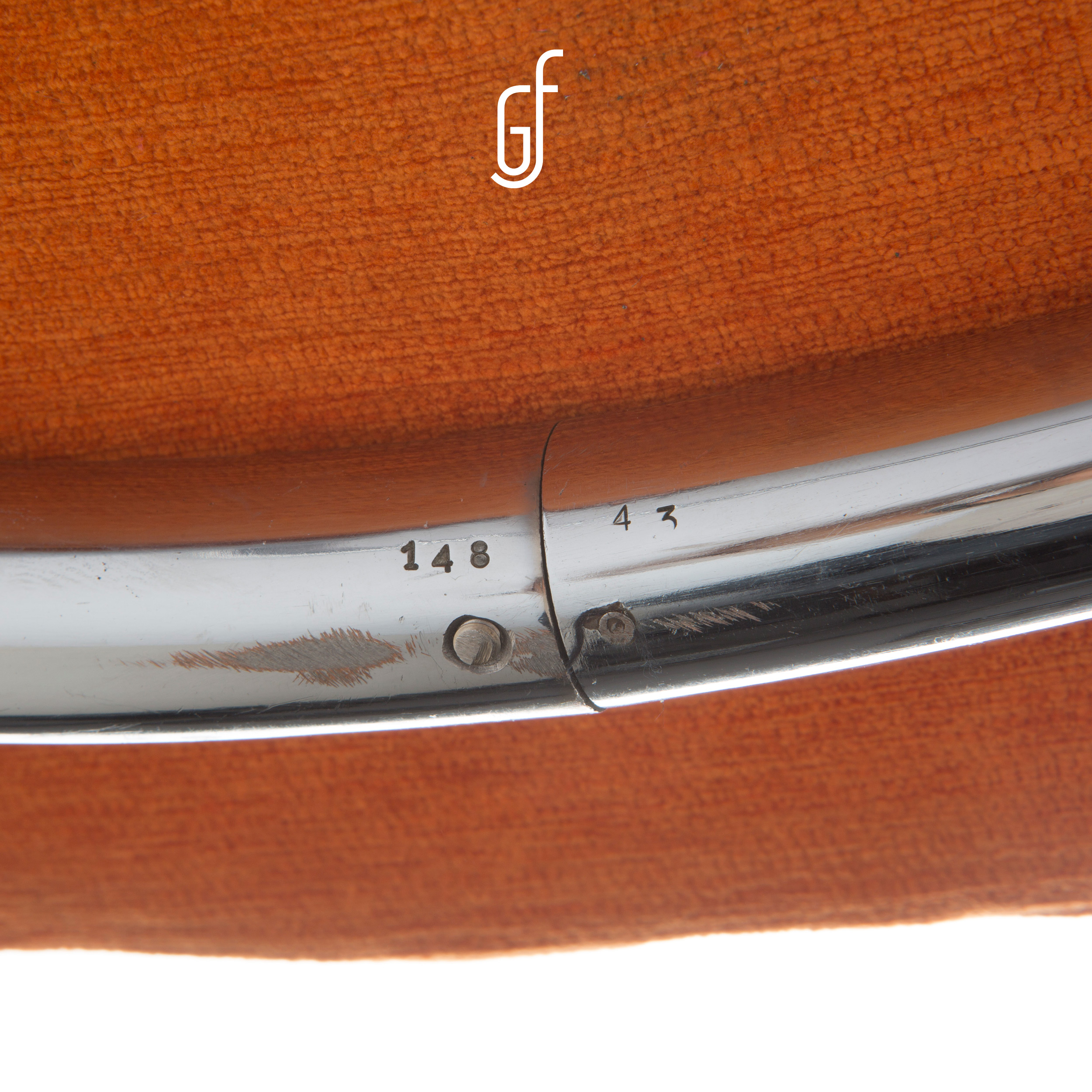 odborně restaurovaný originál, nová výplň a čalounění s kontrastní koženou paspulí, původní dřevo vyspraveno a lakováno v matném laku, původní chrom odborně vyleštěn