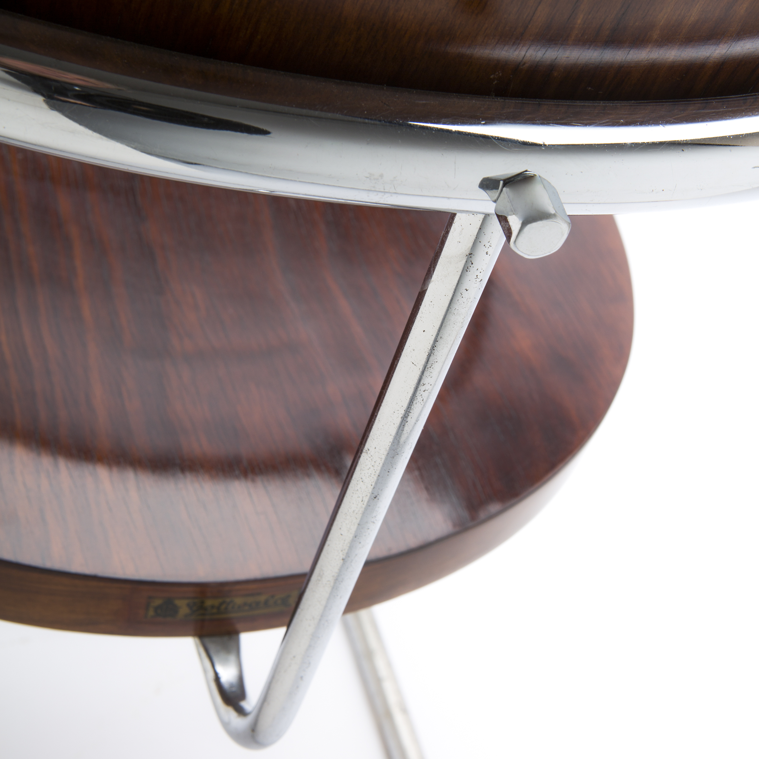 Značeno výrobcem Gottwald. Jedná se o variantu kathalogového typu křesla Ek 10 s kruhovou dispozicí spodní části trubkové konstrukce (viz kathalogové foto obou variant) s absencí dřevěných područek.