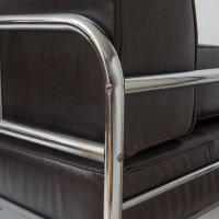 Odborně restaurovaný původní originál výrobce Thonet - MUNDUS. Nová výplň a potah z pravé hovězí kůže v intencích původního vzhledu. Původní chrom trubkové konstrukce pouze vyleštěn, původní, plnohodnotná drátěná konstrukce.