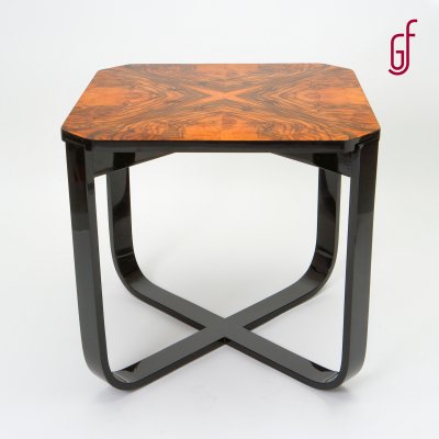 Původní dřevěná konstrukce a dýha opraveny, nová povrchová úprava ve vysoce lesklé šelakové polituře. Původní kovové dílce odborně vyleštěny, nová výplň a čalounění exklusiv.