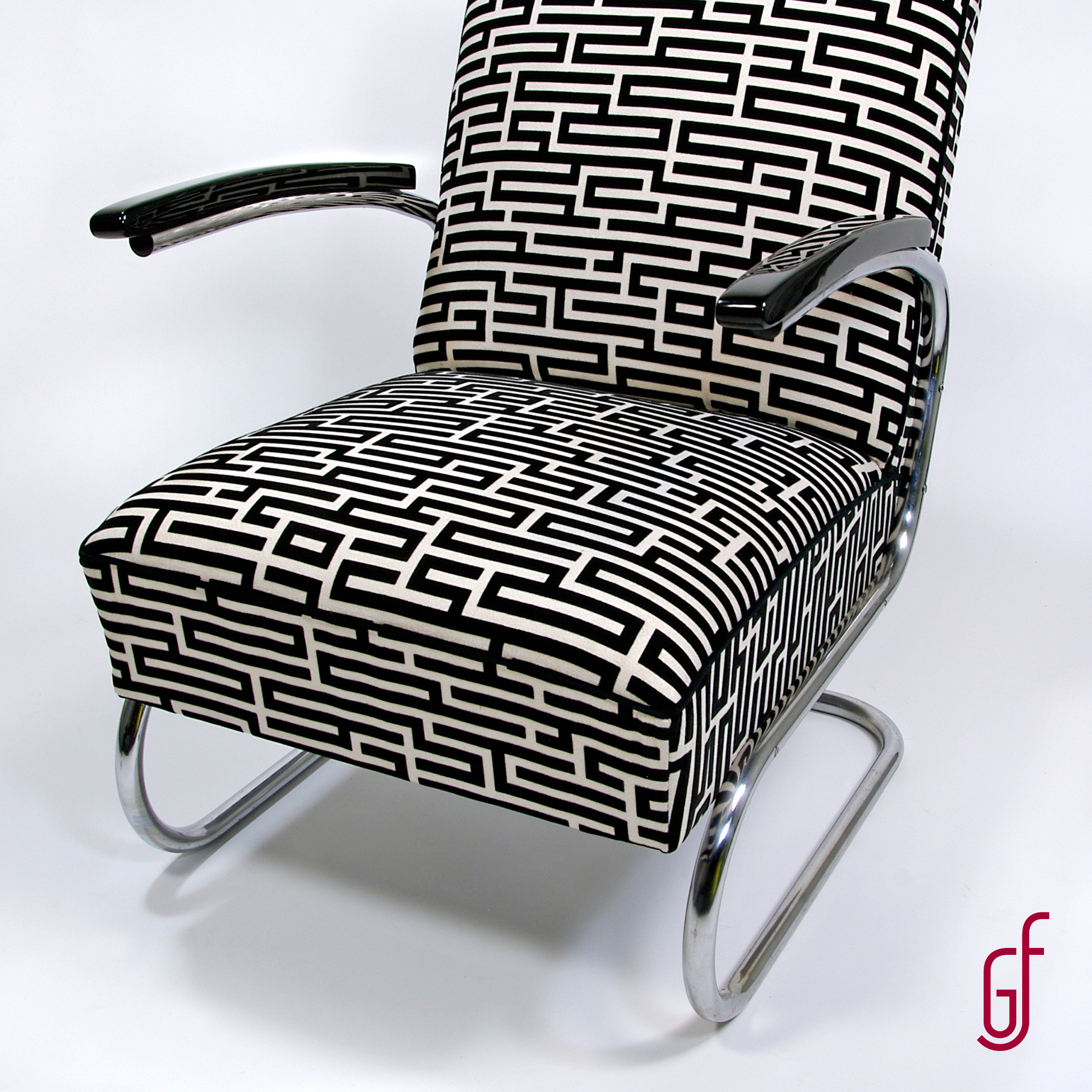 odborně restaurovaný originál, nové čalounění, původní chrom vyleštěn, područky lakovány polyuretanem do vysokého lesku v kontrastním odstínu